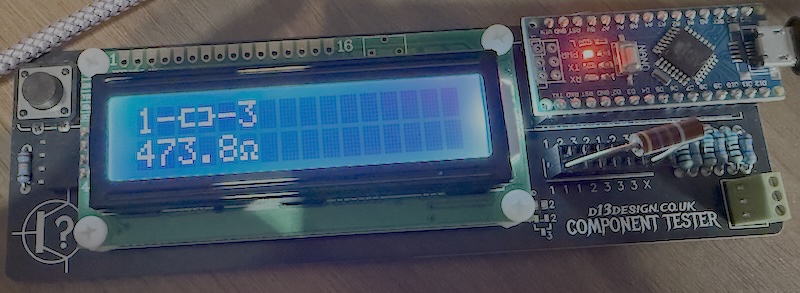Step 6 - power up with a USB cable and give it a quick test. Everything should power up straight away and you'll get a loader message on the LCD screen. Pressing the button will give you an error that there's a missing (or broken) component. Give it a test with some components you know the values of - resistors are good - and validate the results.